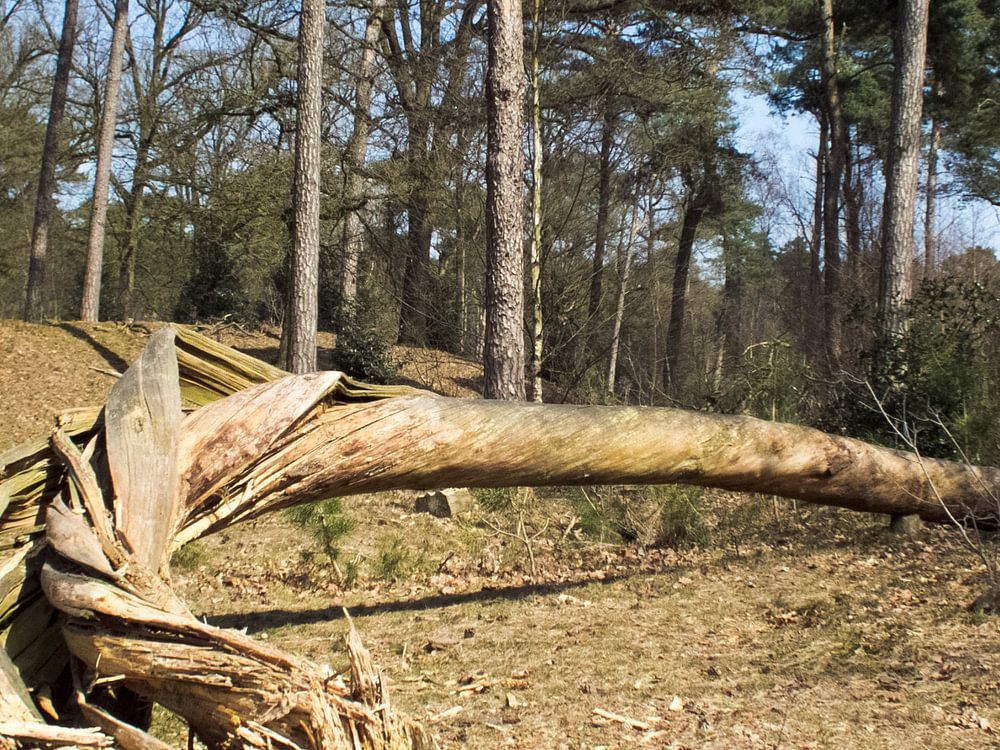 Een gedraaide gevelde pijnboom, genomen bij het natuurpark Kampina, route Huisvennen bij Boxtel