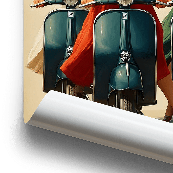 Das Plakat versprüht pure Lebensfreude und italienischen Charme: Im Mittelpunkt stehen drei stilvolle Frauen auf ihren klassischen Vespa Motorrollern. Jede der Frauen trägt ein elegantes Outfit in einer der Farben der italienischen Flagge – sattes Grün, strahlendes Weiß und leuchtendes Rot. Ihre Kleider wehen im Fahrtwind, während sie…