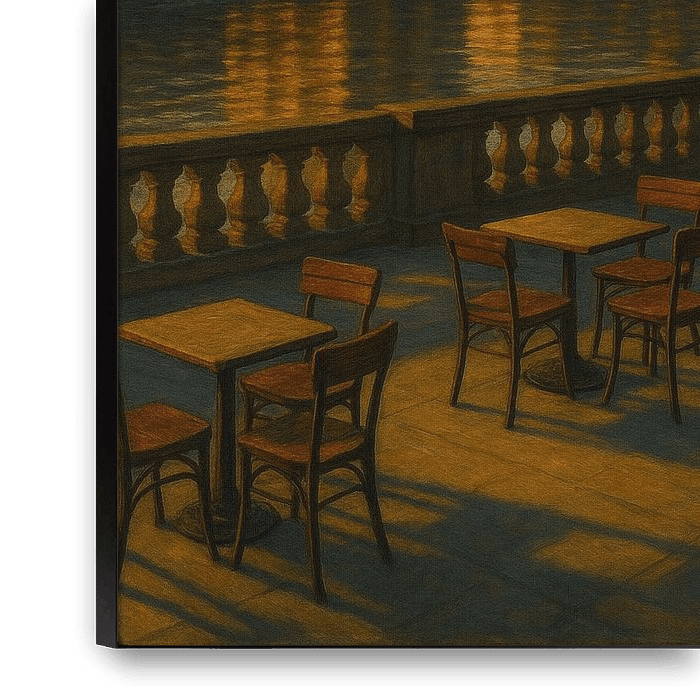 Dresdens abendliche Eleganz entfaltet sich entlang des ruhigen Elbufers, wo Licht und Architektur in perfekter Balance aufeinandertreffen. Die Frauenkirche und die barocke Skyline erheben sich stolz in der untergehenden Sonne, ihre Spiegelungen erstrecken sich über das ruhige Wasser. Im Vordergrund stehen leere Cafétische, die von den…
