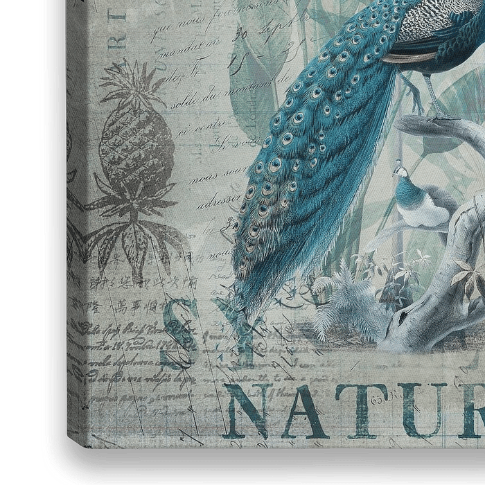 Majestätischer Pfau in tropischem Regenwald mti Farn und Schrift-Elementen