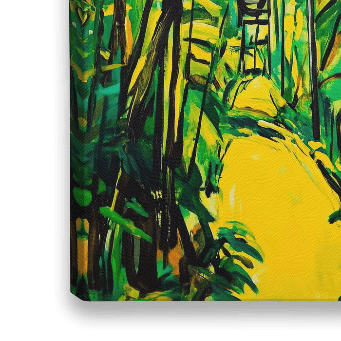 Ein lebendiges Spiel aus satten Grüntönen und leuchtendem Gelb zieht den Betrachter in eine üppige, dschungelartige Welt. Hohe, filigrane Strukturen gehen harmonisch mit der dichten Natur einher, während das Licht geheimnisvoll durch das Blätterdach blitzt. Ein schmaler Pfad zieht den Blick in die Tiefen dieser tropischen Oase und lädt zur Erkundung ein.