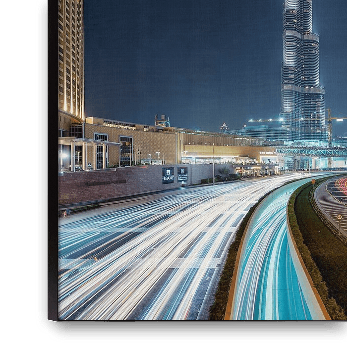 Burj Khalfa in Dubai mit AUto Lichtspuren