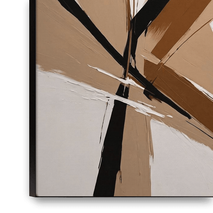 Diese faszinierende abstrakte Kreation spielt mit der Vorstellungskraft des Betrachters. Dominierend sind die monochromen Farbtöne, die von tiefem Schwarz bis zu sanften Beige- und Cremetönen reichen. Die dynamische Komposition, die durch scharfe und geschwungene Linien gekennzeichnet ist, suggeriert Bewegung und Tiefe. Das Design…