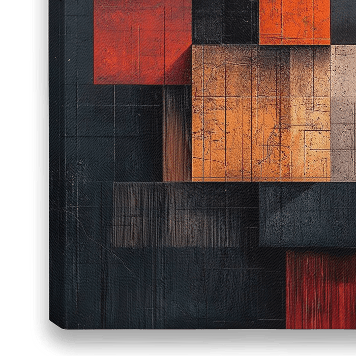 Eine moderne abstrakte geometrische Komposition mit einer Vielzahl von ineinandergreifenden Schichten aus Quadraten und Rechtecken. Das Bild zeigt eine strukturierte Oberfläche mit kontrastierenden Farbtönen, die ein dynamisches visuelles Spiel zwischen Licht und Schatten erzeugen.