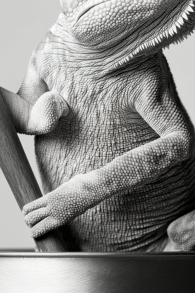 In einem skurrilen Moment steuert eine charmante Echse mit einem Kochlöffel das Geschehen aus einem silbernen Topf. Ihr unverwechselbarer Blick und die humorvolle Pose bringen lebendige Frische in jeden Raum. Ideal für die Küche oder ein quirliges Esszimmer verleiht dieses Kunstwerk einen Hauch von Abenteuer und Unkonventionalität.