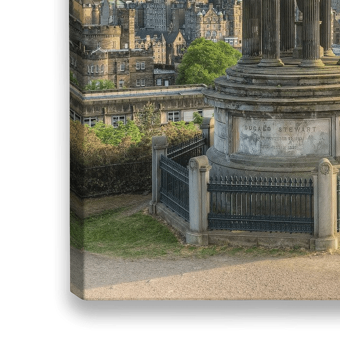 Blick vom Calton Hill in Richtung der Altstadt von Edinburgh mit dem Edinburgh Castle, im Vordergrund das Dugald Stewart Monument.