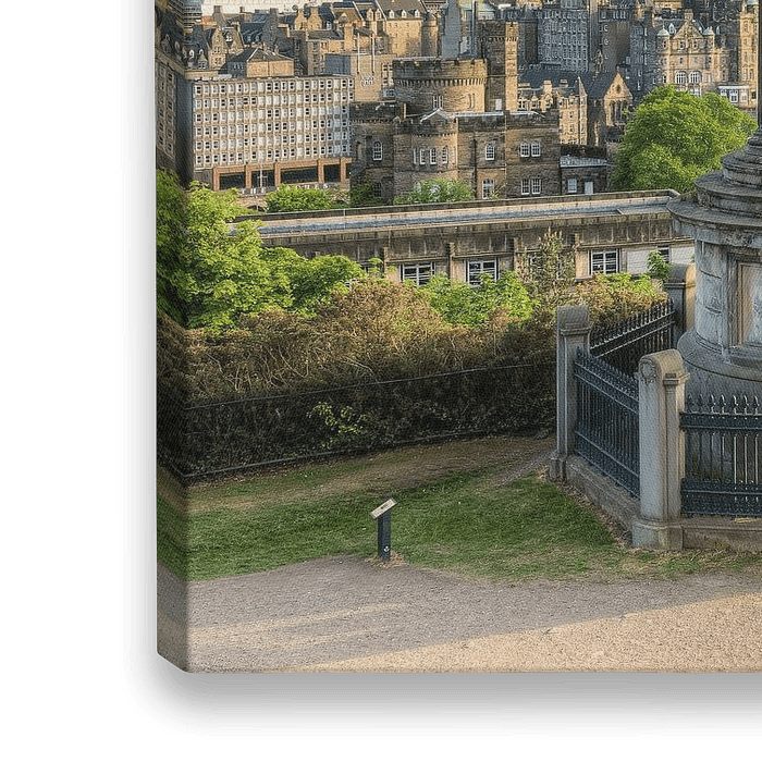 Blick vom Calton Hill in Richtung der Altstadt von Edinburgh mit dem Edinburgh Castle, im Vordergrund das Dugald Stewart Monument.