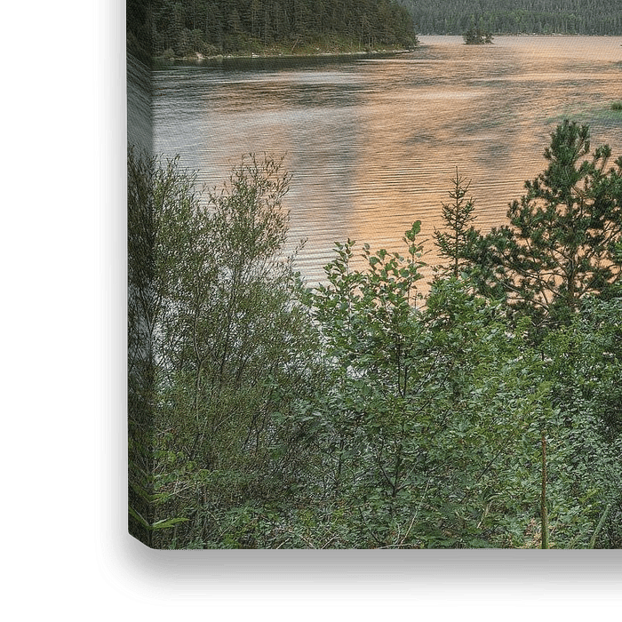 Blick über den Eibsee in Richtung Wettersteingebirge mit der Zugspitze als höchsten Gipfel. Kurz vor Sonnenuntergang wird die Bergkette in ein schönes warmes Licht getaucht, das auch als Alpenglühen bezeichnet wird.