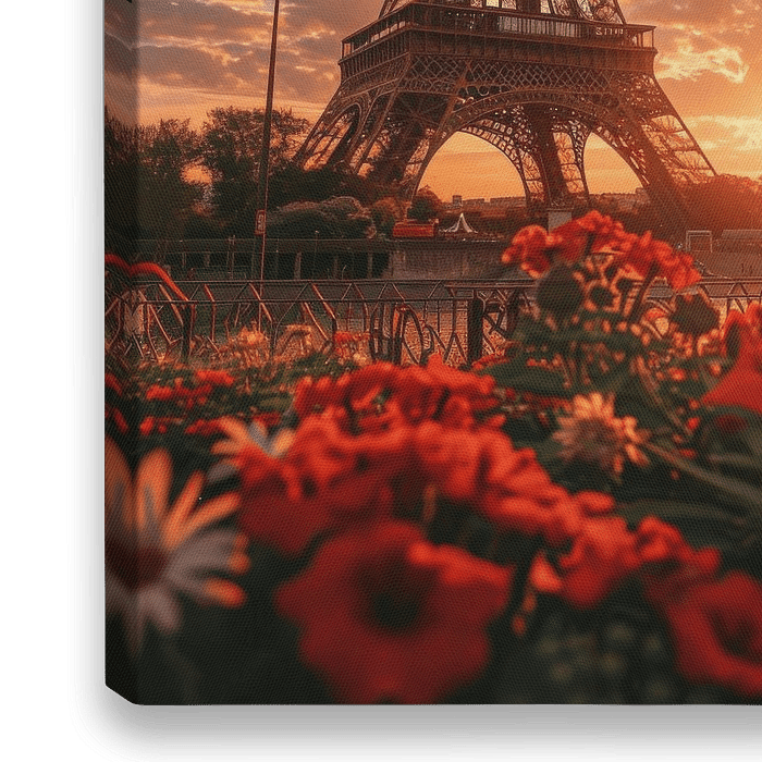 Das Bild zeigt den majestätischen Eiffelturm, der sich majestätisch gegen einen dramatistischen Sonnenuntergang abhebt. Die warme Farbenpracht des Himmels kontrastiert lebhaft mit den leuchtenden, roten Blumen im Vordergrund. Das gesamte Szenario strahlt eine romantische Atmosphäre aus und fängt die Essenz von Paris perfekt ein.