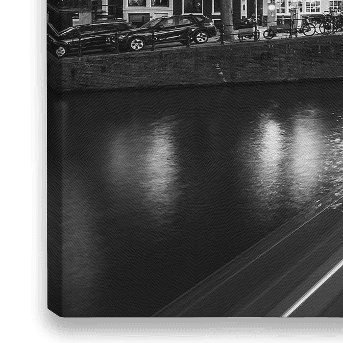 Ein Schwarz-Weiß-Foto von einem Grachtenboot unter der Brücke durch die Grachten in der Nähe der Keizersgracht und Leidsegracht im Zentrum von Amsterdam, Niederlande.