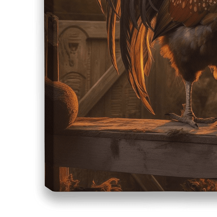Ein Hahn kräht bei Sonnenaufgang, thront auf einem alten Holzzaun, im Hintergrund geht die Sonne auf.