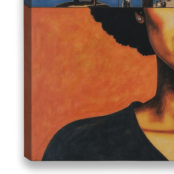 Diese Collage zeigt einen Moment der Verbindung zwischen einer Touristin und der Welt um sie herum. Das Gesicht der Frau ist von weichen Zügen umrahmt, die ihre Neugier und ihr Staunen zeigen. Hinter ihrer Brille ist die Welt ein Kaleidoskop von Landschaften, alle unterschiedlich und voller Farben, die die Fragmente dessen zeigen, was…