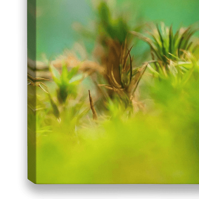 Die kleine Welt vergrößert, ein Wald aus Moos auf einem sonnigen Stück Land. Zwischen den Bäumen bei Torhout in Belgien