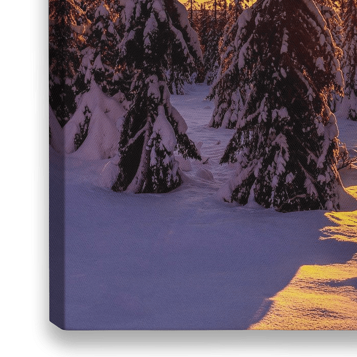 Eine typische verschneite Winterlandschaft in Norwegen. Dieser Sonnenuntergang, der einen Lichtpfad zwischen den Tannen erzeugt, wurde während der goldenen Stunde in der Nähe der Stadt Lillehammer aufgenommen.