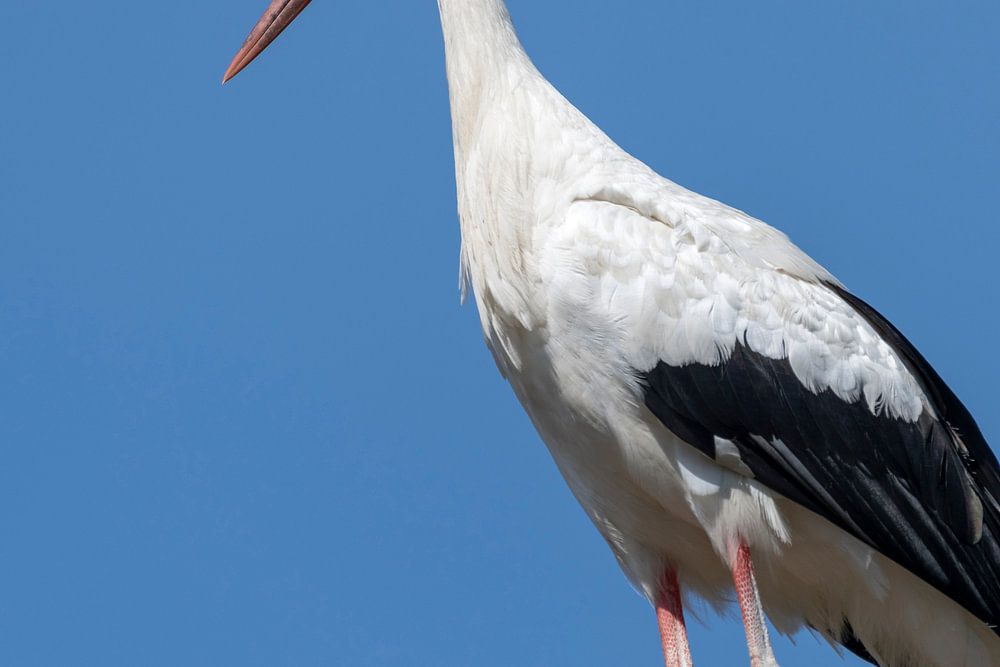 Ein einzelner erwachsener Storch gegen einen blauen Himmel auf einem großen Nest.
