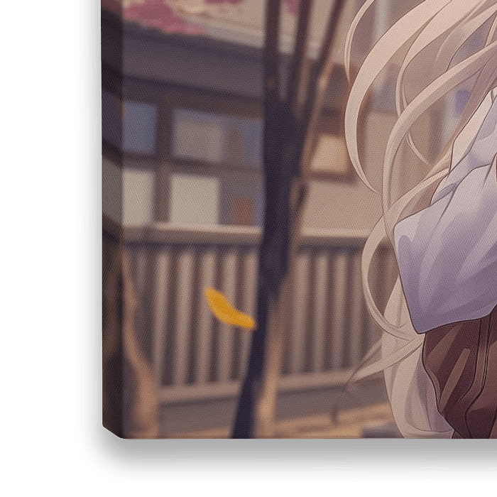 Ein japanisches Anime Highschool-Mädchen mit langen weißen Haaren und blauen Augen, mit blühenden Kirschblüten im Frühling