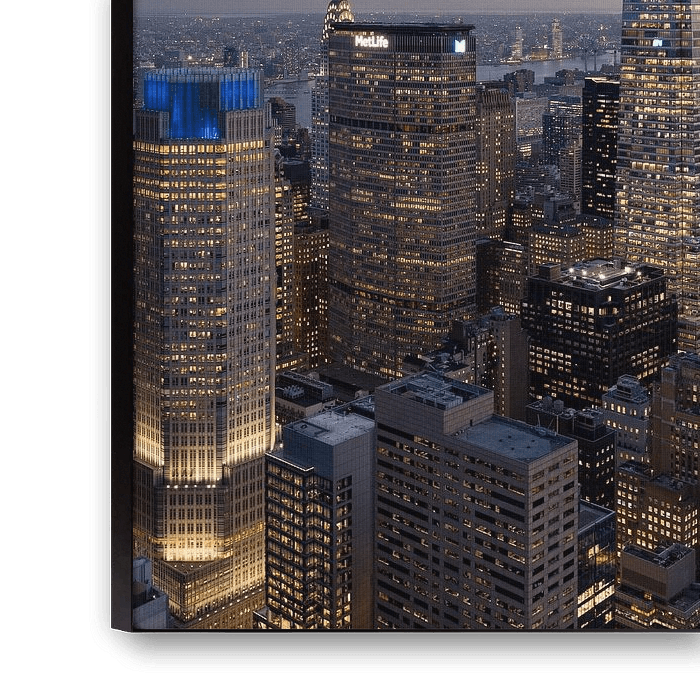 Der Blick vom Top of the Rock in New York während des Sonnenuntergangs, mit dem One Vanderbilt, dem MetLife-Gebäude und dem Chrysler Building im schönsten Licht.