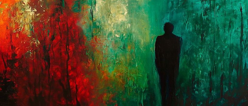 Ein faszinierendes Farbspiel entfaltet sich in einer eindrucksvollen Mischung aus leuchtendem Rot und tiefem Grün, während eine geheimnisvolle Silhouette durch die lebendigen Nuancen wandelt. Diese Kunstwerke schaffen eine mystische Atmosphäre, die besonders gut in einem Wohnzimmer zur Geltung kommt, wo sie zum Nachdenken anregt und Gespräche inspiriert.