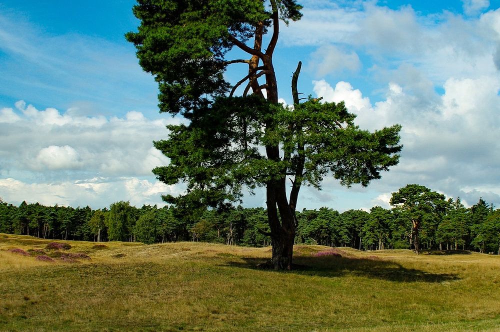 Niederländische Landschaft mit einem einsamen Baum vor einem Hintergrund von blauem Himmel und gestapelten Wolken