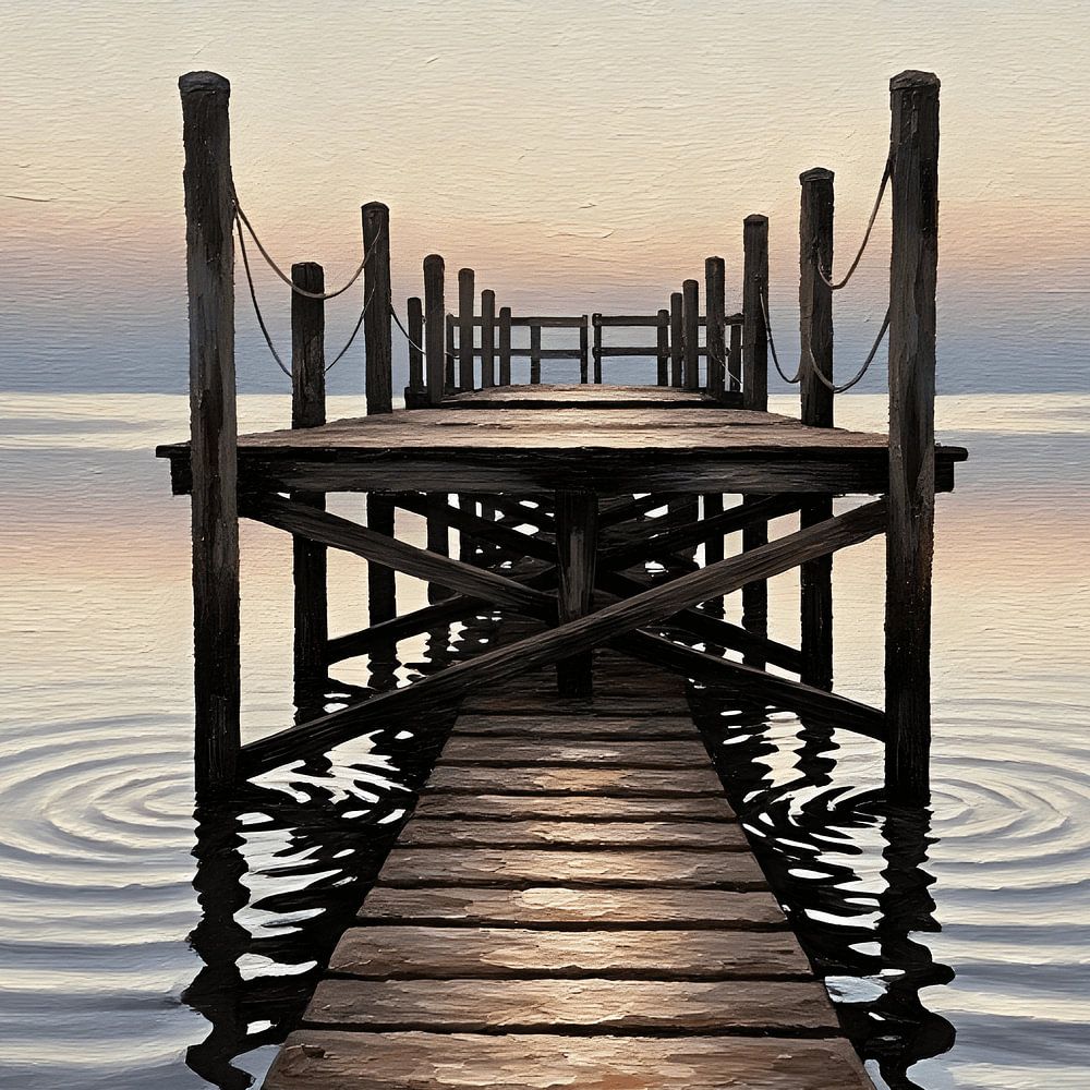 Mit geschichteten Ölpigmenten und ausdrucksstarken Pinselstrichen erweckt der Künstler subtile Texturen zum Leben - das Plätschern des Wassers, die Maserung des gealterten Holzes und die zarten Lichtverschiebungen am Horizont. Diese reiche Oberflächentiefe verleiht dem Gemälde eine zeitlose Qualität und macht es nicht nur zu einem Bild, sondern zu einer auf Leinwand gebannten Atmosphäre.