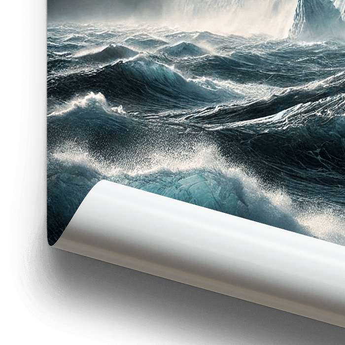 Dieses atemberaubende digitale Poster entführt Dich in eine Welt der Naturgewalten. Ein gigantischer Eisberg erhebt sich wie eine uneinnehmbare Festung aus dem aufgewühlten Ozean. Die meterhohen Wellen tosen gegen seine frostigen Klippen, während dunkle Gewitterwolken den Himmel bedecken.…
