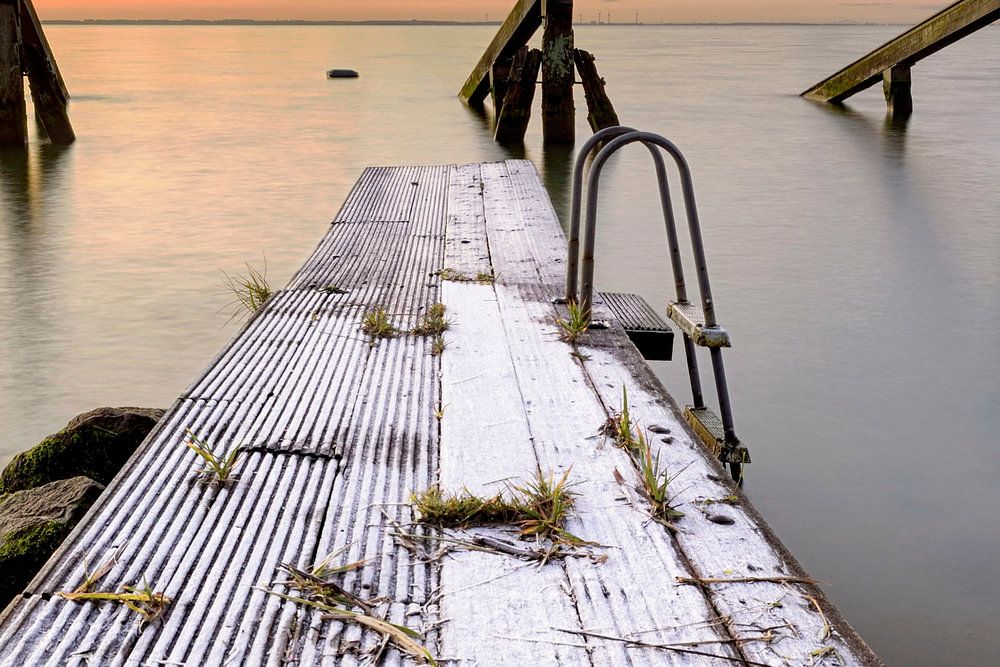 Eisbrecher Marken bei Sonnenaufgang mit etwas Frost auf dem Steg.