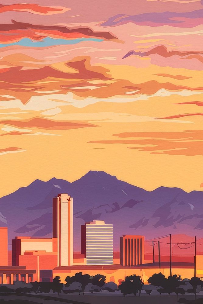 Die warmen, lebendigen Farben des Sonnenuntergangs hüllen die charmante Silhouette von El Paso in ein sanftes Licht, während majestätische Berge im Hintergrund thronen. Diese zeitgemäße Illustration bringt eine friedliche Atmosphäre ins Wohnzimmer und lässt den Betrachter in die Schönheit einer Stadt eintauchen, die das Gefühl von Heimat und Abenteuern zugleich verkörpert.