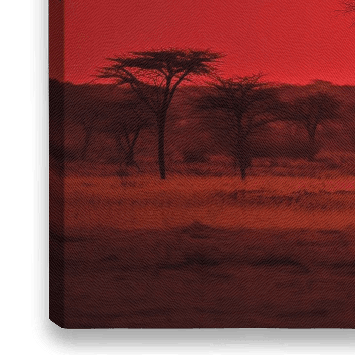 Bestelle das Foto Elefanten in Afrika bei Sonnenuntergang Panorama rot-orange von TheXclusive Art als Reproduktion auf Leinwand, Alu-Dibond, als Poster, Fototapete oder Acrylglasbild.