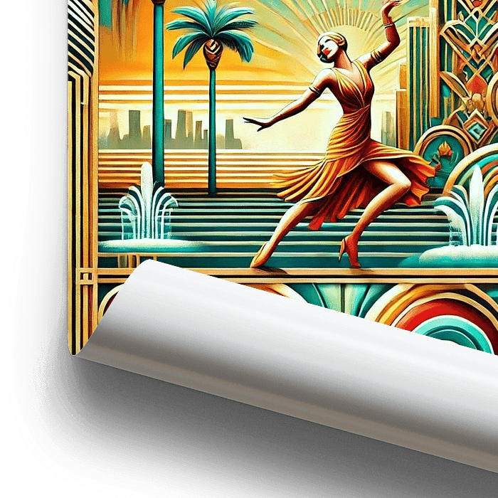 Tauchen Sie ein in die stilvolle Welt der 1920er- und 1930er-Jahre mit diesem ausdrucksstarken Poster im Art Deco-Stil. Die zentrale Figur – eine elegant tanzende Frau in fließendem Kleid – wird umrahmt von strengen geometrischen Formen, Palmen, Wasserspielen und ikonischen Hochhäusern, die an die Architektur der goldenen Ära erinnern.…