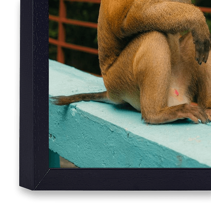 Dieses Bild zeigt einen Makaken, der entspannt auf einem türkisfarbenen Geländer einer Aussichtsterrasse sitzt. Die tropische Umgebung im Hintergrund mit üppigen Blättern und leichtem Schatten vermittelt sofort das Gefühl von Exotik und wilder Natur. Die charakteristische Körperhaltung und das dichte, goldbraune Fell betonen die animalische Eleganz dieser Primatenart. Affen sind in vielen asiatischen Ländern Symbol für Intelligenz, Neugier und Freiheit. Das Motiv spricht Naturliebhaber, Tierfreunde und Reisende gleichermaßen an und bringt einen Hauch tropischen Regenwald und Abenteuer in den Raum. Ideal als Wandbild für Wohnzimmer, Büros oder Praxen, schafft das Bild ein entspannendes und inspirierendes Ambiente. Es erinnert an Begegnungen mit wilden Tieren, den Zauber ferner Länder und die Schönheit der Natur, die in jedem Moment neue Geschichten erzählt.