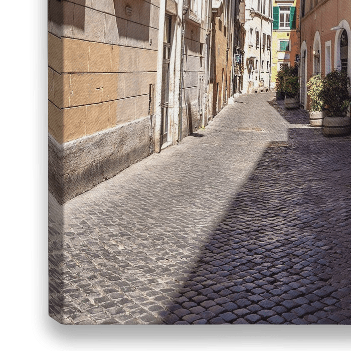 Enge Straße in der Stadt Rom in Italien. Mit Kopfsteinpflaster auf dem Boden und Häusern im typischen Stil dieser Region in orange-gelben Farben.