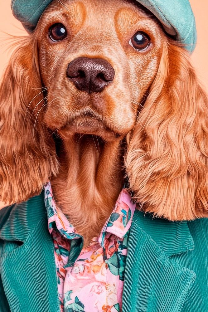 Mit seinem flauschigen, kastanienbraunen Fell und den langen, sanften Ohren strahlt dieser Englische Cocker Spaniel einen charmanten Schick aus. Das schicke Outfit mit Blümchenshirt und mintgrünem Hut verleiht ihm eine unkonventionelle Eleganz, die jeden Betrachter zum Schmunzeln bringt. Ein wahres Fashion-Statement auf vier Pfoten!