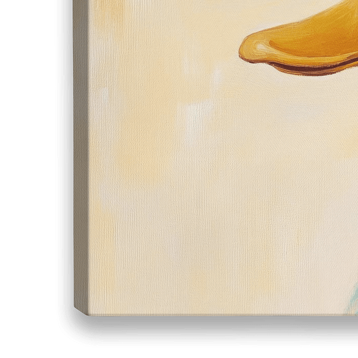 Entenportrait | Ente im Pastellportrait - Dieses Tierbild zeigt eine elegante Ente mit einem rosa Hut, der mit weißen Punkten und einer bunten Schleife verziert ist, vor einem weichen pastellgelben Hintergrund.
