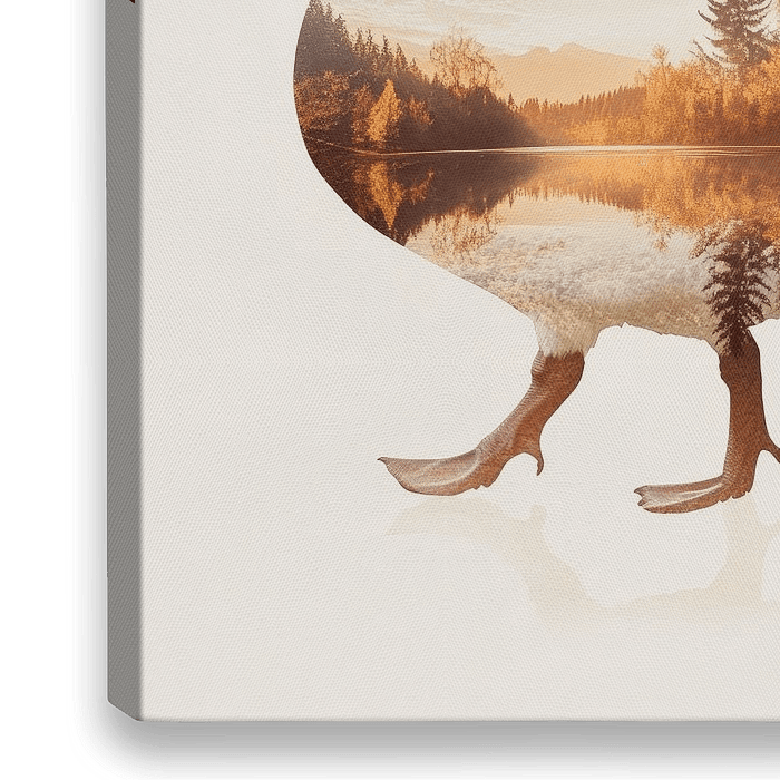 Eine elegante Gans, gefüllt mit der ruhigen Schönheit der Natur, die sanften Hügel und reflektierenden Seen präsentiert. Diese harmonische Verschmelzung von Tier und Landschaft bringt eine beruhigende, fast meditative Stimmung in jeden Raum. Ideal für das Wohnzimmer, um eine entspannende und einladende Atmosphäre zu schaffen.
