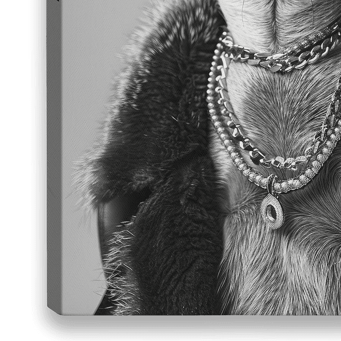 Porträt eines Erdmännchens in stilvoller Kleidung, inklusive Hut und Sonnenbrille, aufgenommen in einem monochromen Stil.