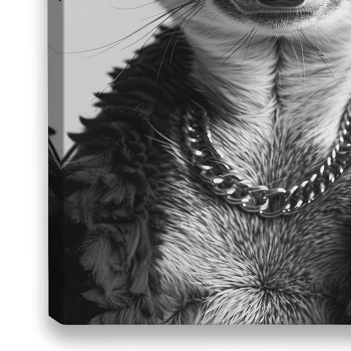 Porträt eines Erdmännchens in stilvoller Kleidung, inklusive Hut und Sonnenbrille, aufgenommen in einem monochromen Stil.