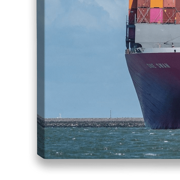 Bestelle das Foto Erst aus der Nähe erkennt man, wie gigantisch dieses Containerschiff ist. Das Megacontainerschiff On von Jaap van den Berg als Reproduktion auf Leinwand, Alu-Dibond, als Poster, Fototapete oder Acrylglasbild.