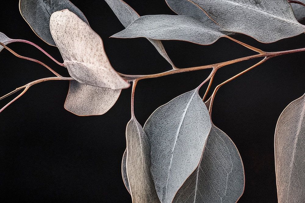 Eine sanfte Eleganz entfaltet sich in der subtilen Darstellung von zarten, silbern schimmernden Blättern, die sich harmonisch gegen einen tiefen, mysteriösen Hintergrund abheben. Diese botanische Komposition verleiht jedem Raum einen Hauch von Stil und Ruhe, ideal für das Schlafzimmer, wo sie eine entspannte Atmosphäre schafft.