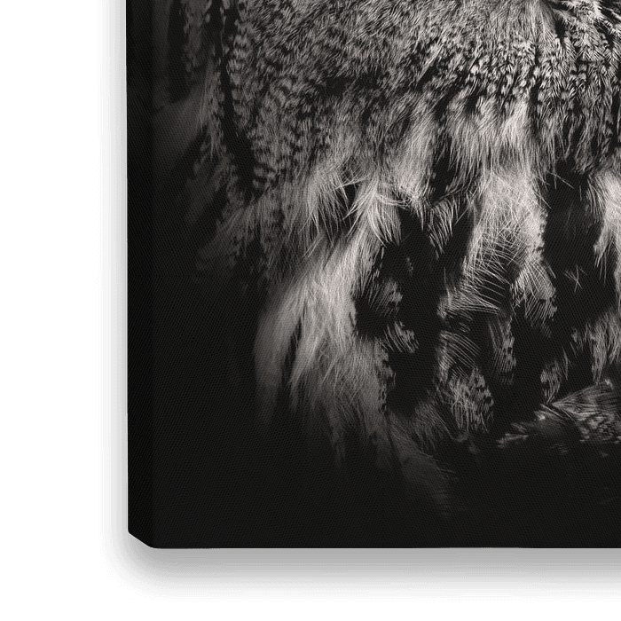 Porträtfoto eines Uhus, das digital in Schwarz-Weiß verbessert wurde, wobei nur die Augen in Farbe sind. Sieht toll aus in einem kühlen oder industriellen Innen- und Wohnstil. Digitale Kunst