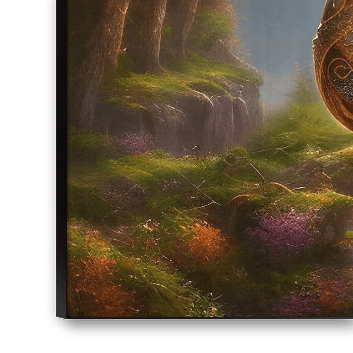 Ein goldenes Fabergé-Ei steht in einer fantastischen Herbstlandschaft mit Bergen, Wasserfällen und braunen Bäumen.