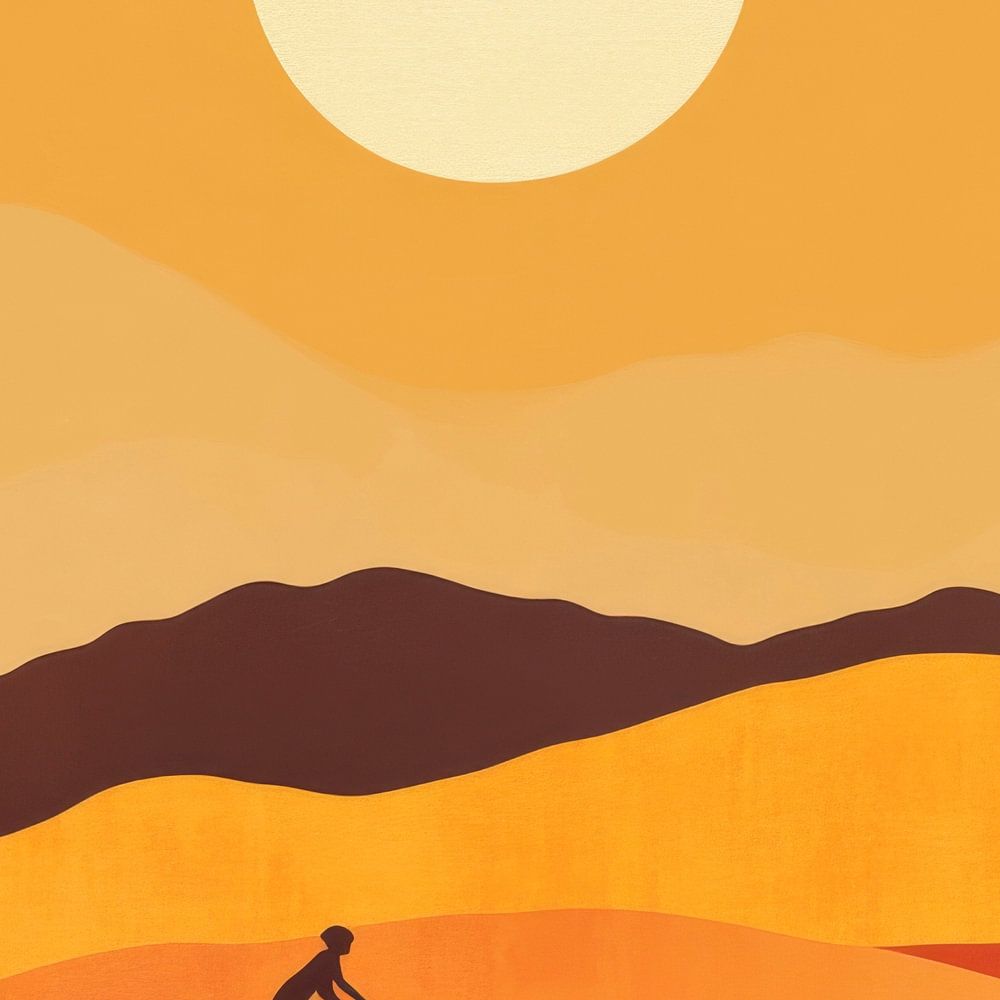 Ein Radfahrer durchquert eine weite, goldene Landschaft, während die Sonne in einem warmen Gelb erstrahlt. Die sanften, geschwungenen Hügel in verschiedenen Erd- und Goldtönen laden zu einem Gefühl von Freiheit und Abenteuer ein. Dieses gestalterische Spiel von Licht und Farbe evoziert eine friedliche, nostalgische Reise durch endlose Weiten.