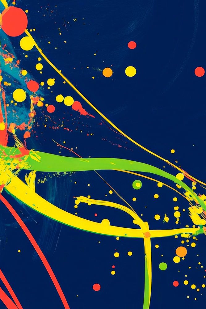 Ein lebendiges Zusammenspiel aus leuchtenden Farben tanzt über einen tiefblauen Hintergrund, während dynamische Linien und spritzende Punkte ein Gefühl von Bewegung und Energie erzeugen. Dieses künstlerische Werk bereichert jedes Wohnzimmer und schafft eine inspirierende Atmosphäre, die den Raum mit kreativer Frische erfüllt. Perfekt für fröhliche Zusammenkünfte und entspannte Abende!