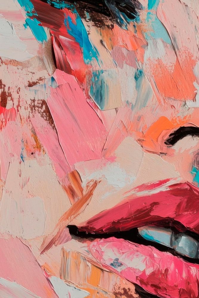 Ein lebendiges Spiel aus Farben und Formen entfaltet sich, wobei sanfte Pinselstriche eine ergreifende Harmonie schaffen. Die vermischten Töne von Rosa und Blau umspielen das Gesicht, während die geschlossenen Augen und die sanft geschwungene Lippe eine stille Intimität ausstrahlen. Ein Ausdruck von Emotionen, der sowohl zart als auch kraftvoll wirkt.