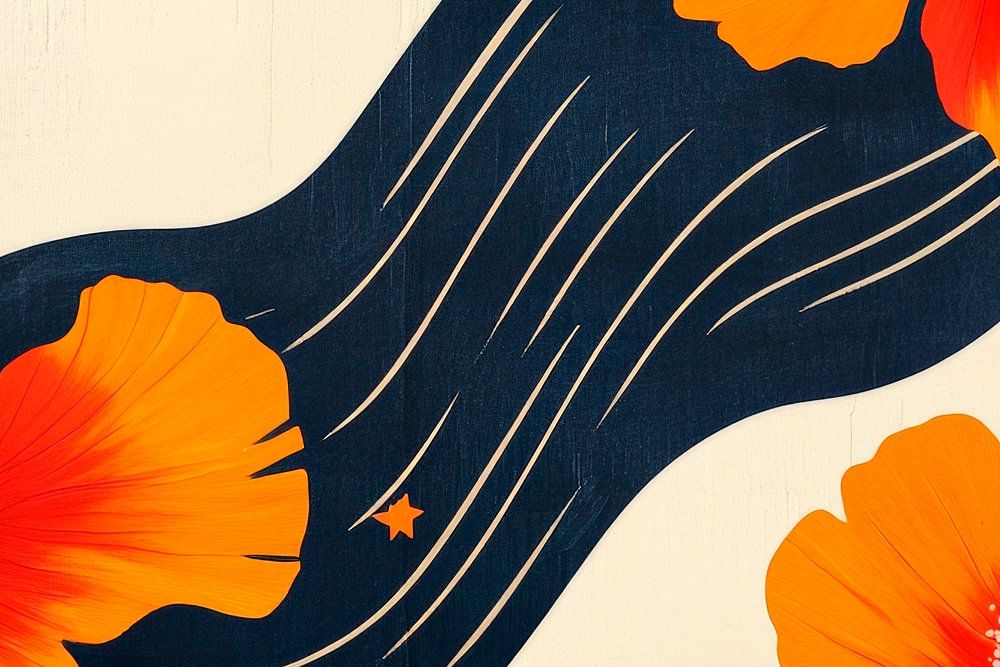 Lebendige Hibiscusblüten in strahlendem Orange und Rot tanzen über einen sanft geschwungenen Hintergrund in tiefem Blau und Gold. Die harmonische Verbindung von Farben und Formen verleiht jedem Raum ein Gefühl von Frische und Exotik. Ideal für eine moderne Küche oder ein einladendes Wohnzimmer, setzt es elegante Akzente und weckt das Urlaubsgefühl.