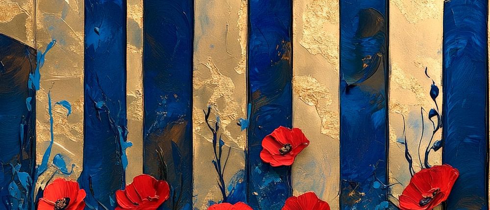 In einem harmonischen Zusammenspiel von tiefem Blau und schimmerndem Gold entfalten leuchtend rote Mohnblüten ihre Pracht. Die geometrischen Formen erzeugen eine moderne Eleganz, die lebendige Frische und zeitlose Schönheit vereint. Perfekt für ein Wohnzimmer, verleiht es dem Raum einen Hauch von Kunst und Stil, der zum Verweilen einlädt.