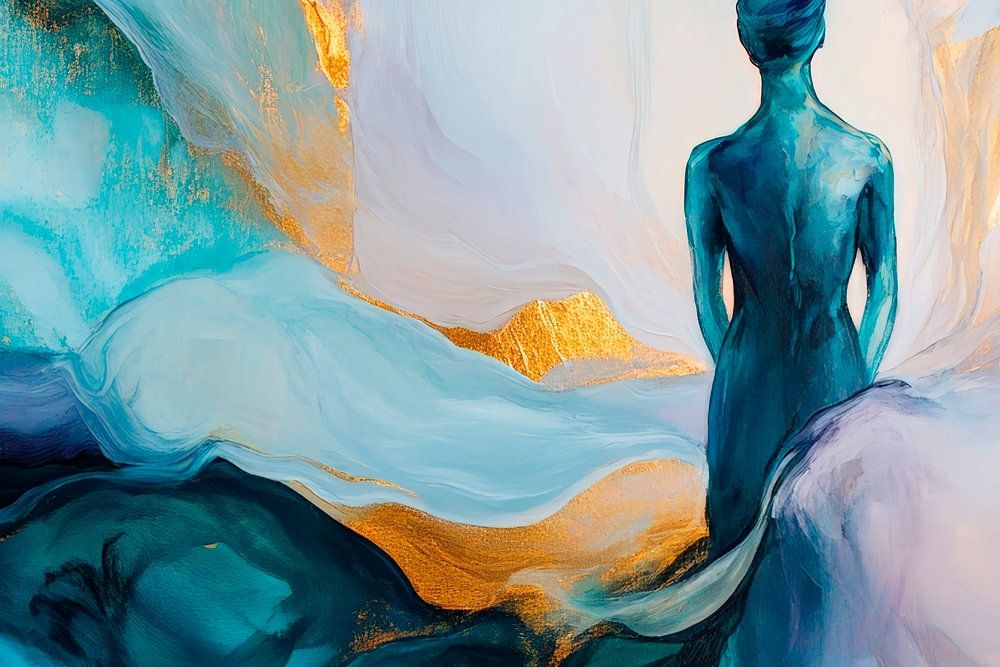 In sanften, fließenden Farben strahlt eine mysteriöse Silhouette zwischen tiefen Blau- und Goldtönen. Diese faszinierende Komposition weckt Assoziationen von Träumen und innerer Ruhe. Perfekt für das Schlafzimmer, wo sie eine beruhigende Atmosphäre schafft und zum Nachdenken anregt. Ein visuelles Erlebnis, das die Sinne berührt und die Fantasie beflügelt.
