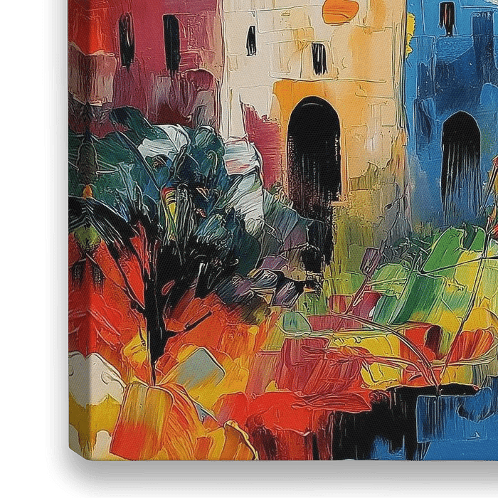 Bestelle dieses abstrakte Wandbild Farbenfrohe Toskana von ARTemberaubend als Reproduktion auf Leinwand, Alu-Dibond, als Poster, Fototapete oder Acrylglasbild.
