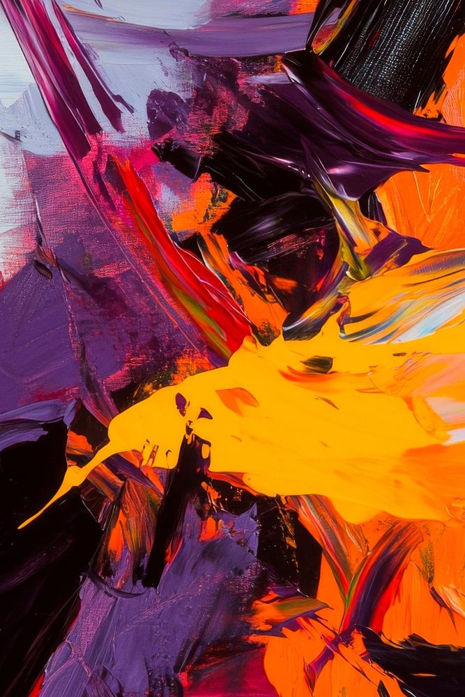 Ein feuriges Zusammenspiel von Farben entfaltet sich, während lebhafte Orangetöne leidenschaftlich auf die tiefen Violett- und Schwarznuancen prallen. Der Schwung der Pinselstriche erzeugt eine dynamische Bewegung, die an einen emotionalen Ausdruck oder einen Kampf erinnert, wobei die kräftigen Farbschichten eine faszinierende Tiefe und Intensität vermitteln.