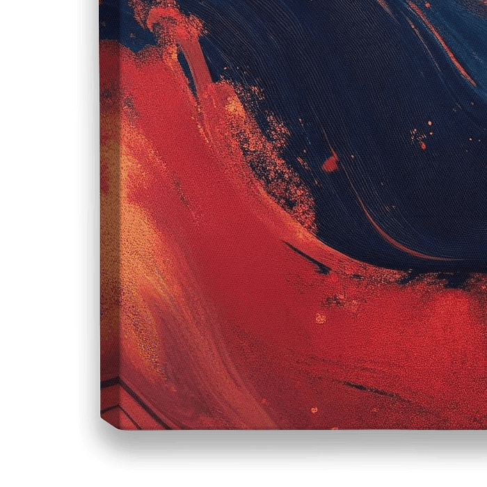 Ein faszinierendes Farbenspiel entfaltet sich in tiefen, strahlenden Blau- und Rottönen, die harmonisch miteinander fließen. Goldene Akzente verleihen dem Bild einen Hauch von Eleganz und Mystik. Ideal für ein modernes Wohnzimmer, wo es als Mittelpunkt lebendige Gespräche anregen und die Fantasie beflügeln kann.