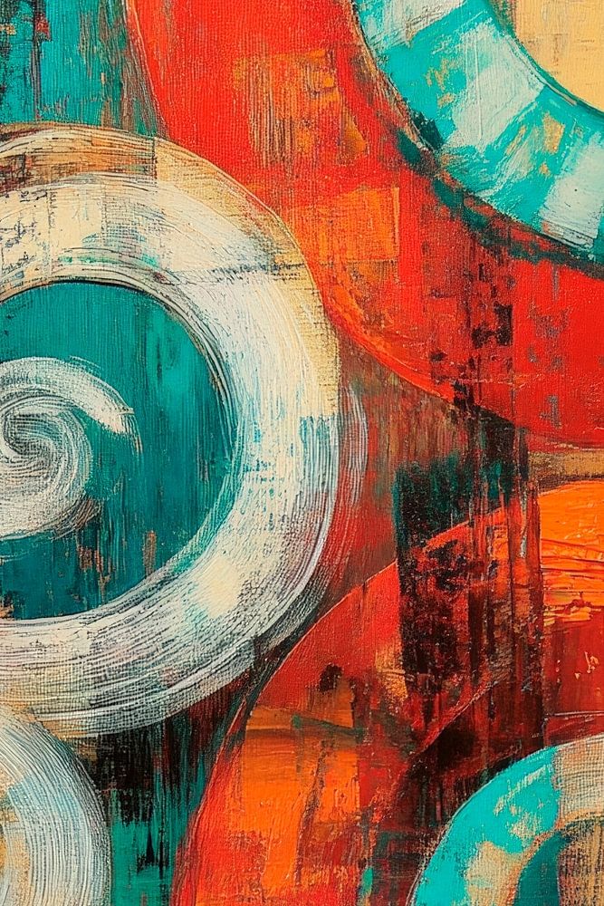 Mit lebhaften Farbtönen von Türkis und Orange tanzen dynamische Spiralen über die Oberfläche. Diese aufregende Komposition bringt Bewegung und Energie in jeden Raum. Ideal für ein kreatives Wohnzimmer oder ein inspirierendes Büro, wo die Farbspiele die Fantasie anregen und eine einladende Atmosphäre schaffen.